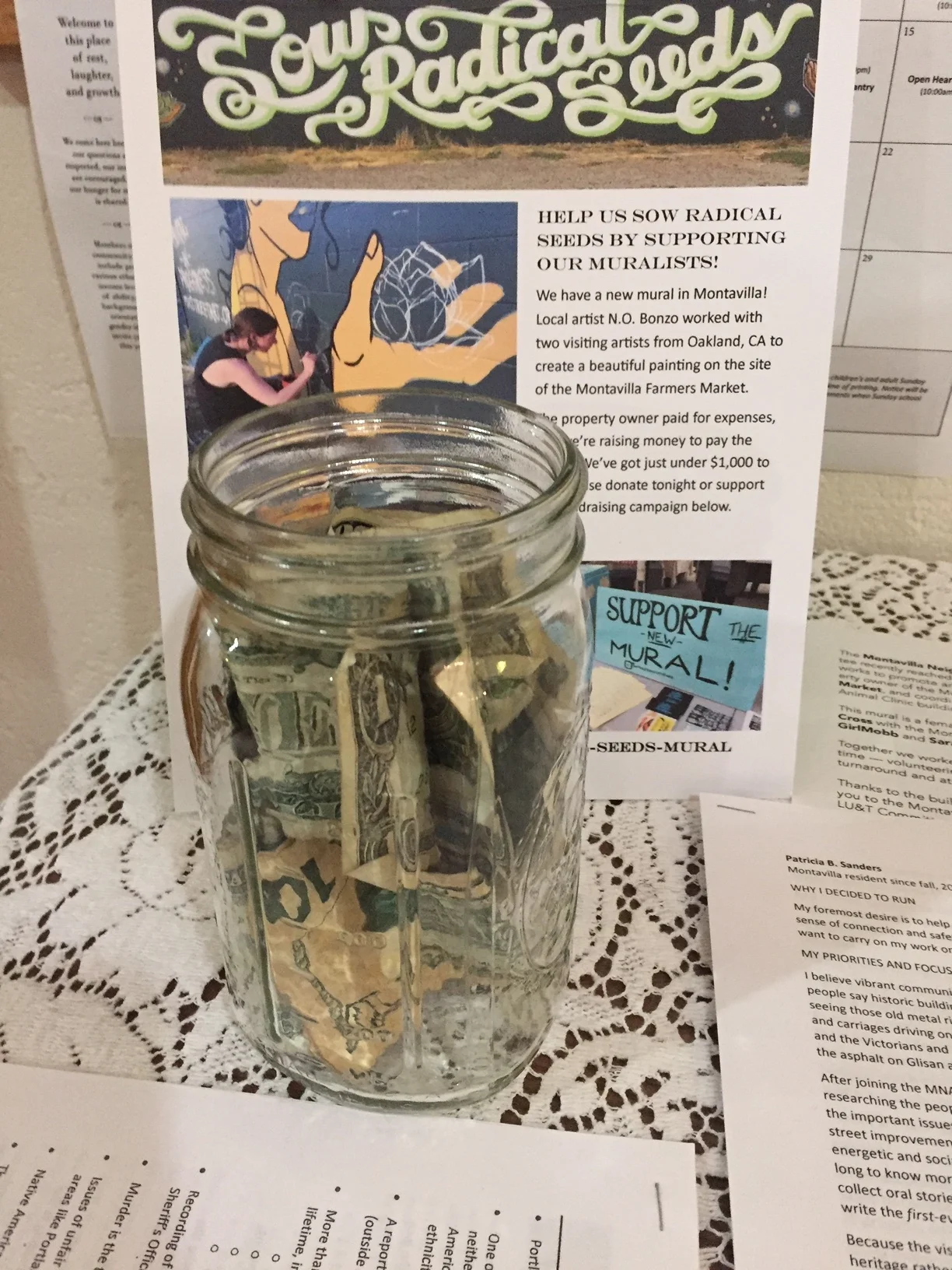See the Annual Report presentation on our Newsletters page and check out some photos below! Thanks to Tina Granzo for lending us the awesome Stark Street backdrop that she painted for the photo booth! Finally, we raised $288 toward paying the artists who created Montavilla’s newest public art mural at the farmers market site. You can contribute too!